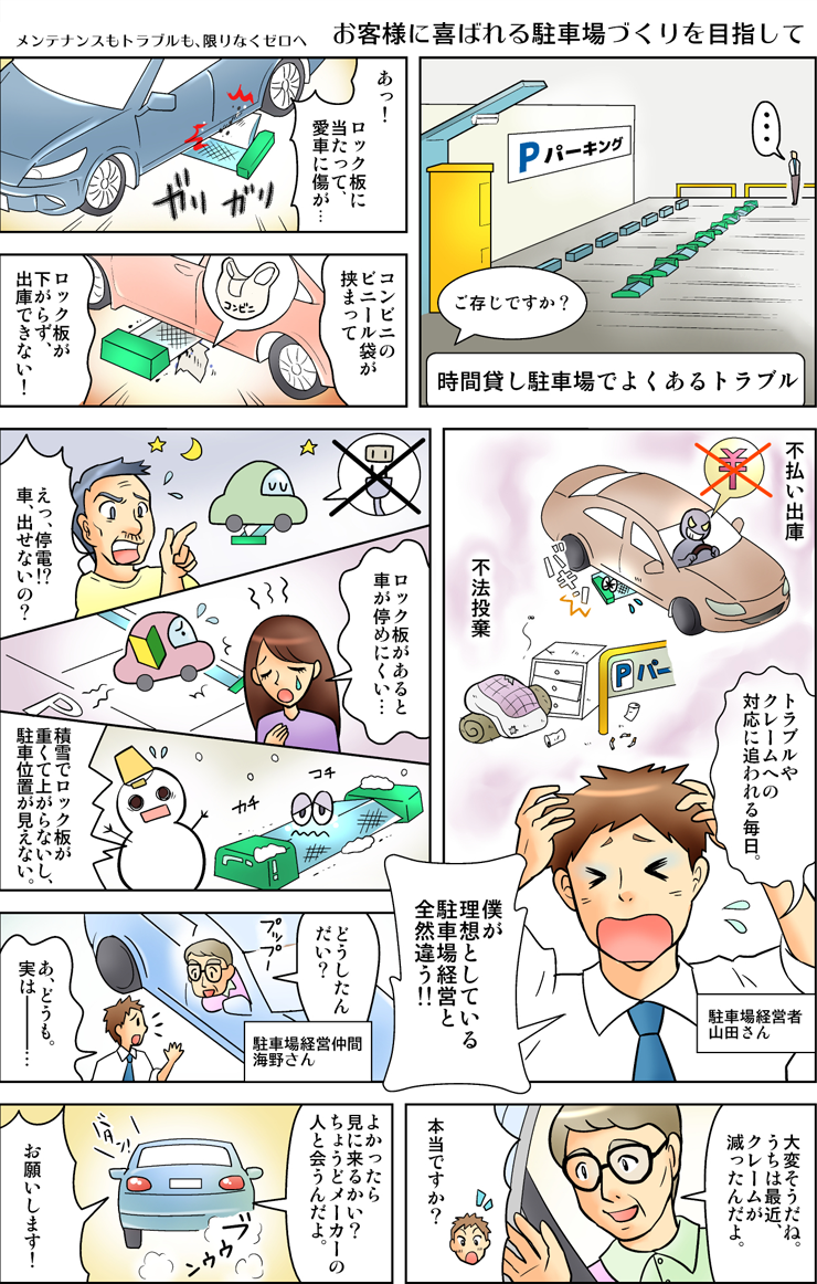 コインパーキングの駐車スペースの中心に設置されているロック板の存在は、特に運転初心者のお客様に心理的な負担をかけてしまいがちです。