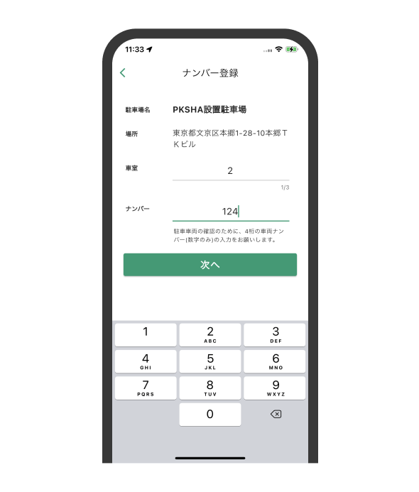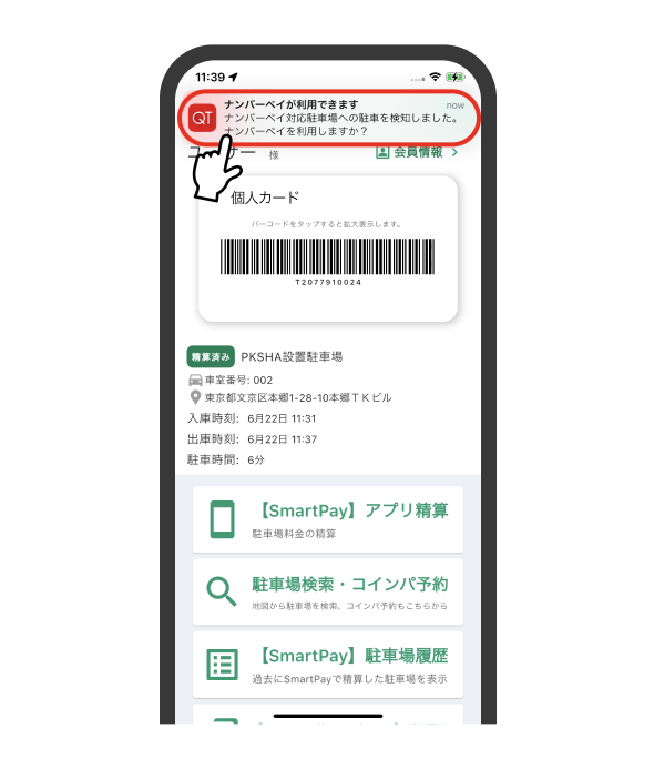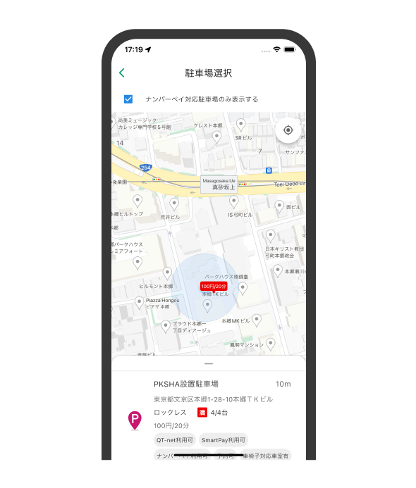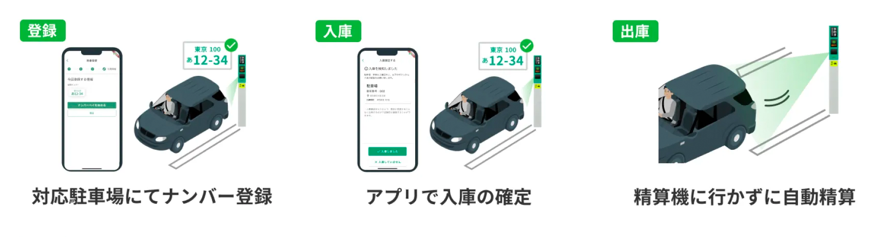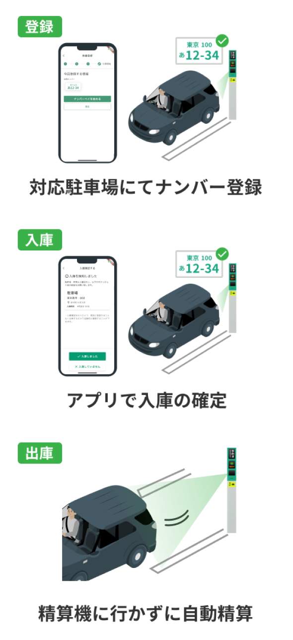 一部対応駐車場にて、ナンバー認証で自動精算が可能です。 ナンバーのご登録は、対応駐車場にて一度ナンバーを認証させるだけ。 次回利用時から、入庫確認のワンタップのみで精算ができます。