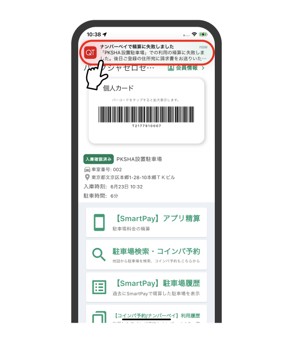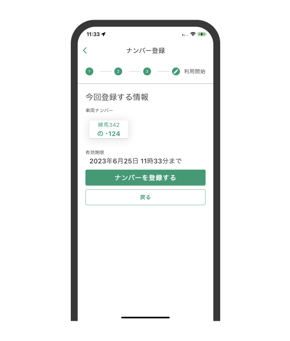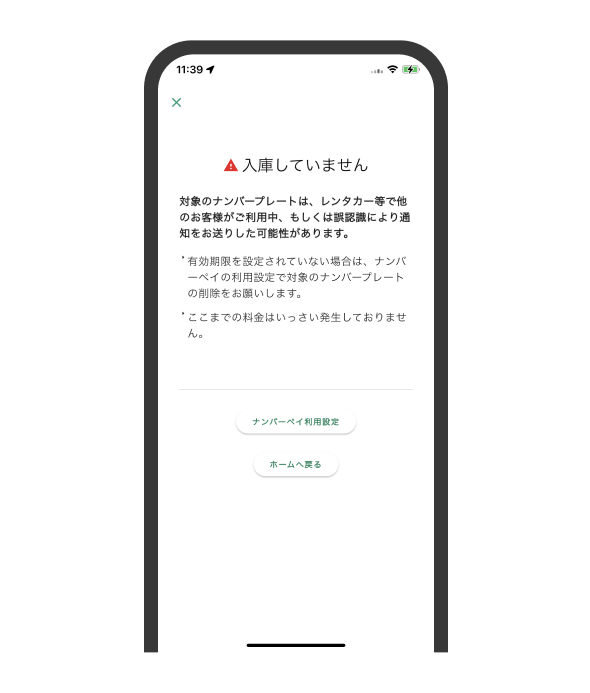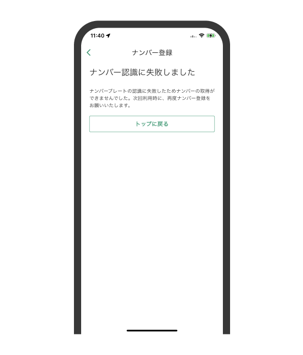 ナンバー登録に失敗した場合、車番登録のエラーになります。入庫をやり直すか、次回利用時に再度実施してください。