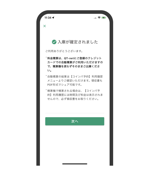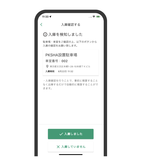 ※「入庫の心当たりない場合や、入庫しても現地精算をしたい場合に「x入庫していません」を押してください」